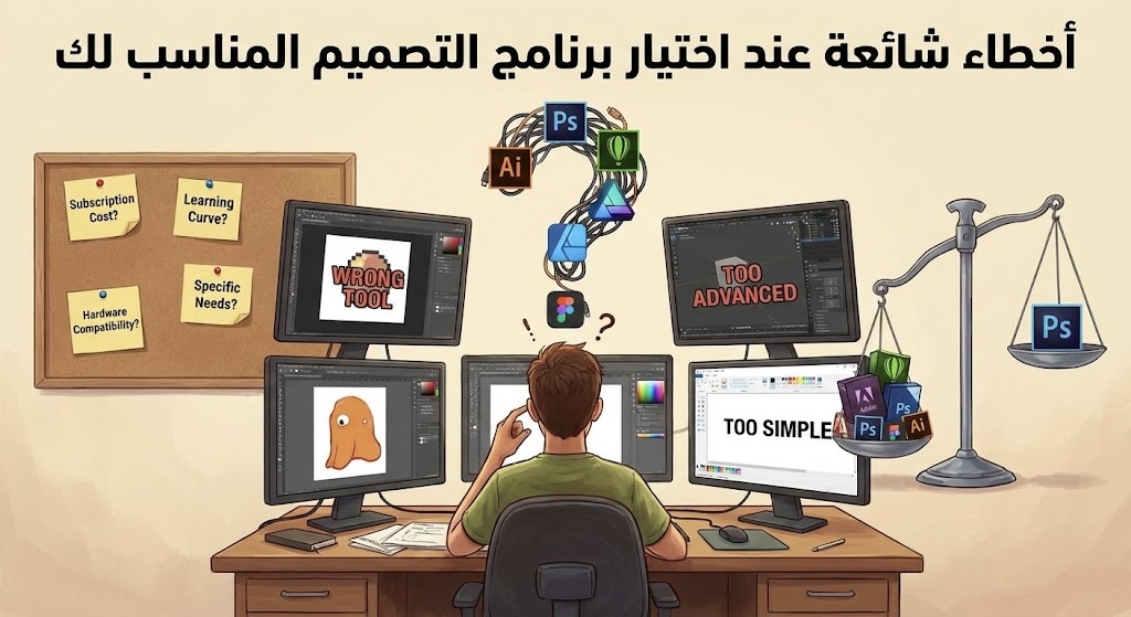 أخطاء شائعة جدا: يختار الكثيرون البرنامج دون خطة تعلم، مما يطيل فترة الإنتاجية. مثال: مصمم اشترى Illustrator لكن تعلم من فيديوهات عشوائية، فأهدر وقتًا طويلًا. لتجنب ذلك، استثمر في دورة منظمة لتسريع التعلم.
