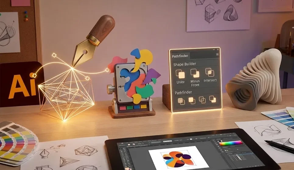 - استخدم Pathfinder مع Shape Builder معًا: Shape Builder للتعديل السريع، Pathfinder للعمليات النهائية.