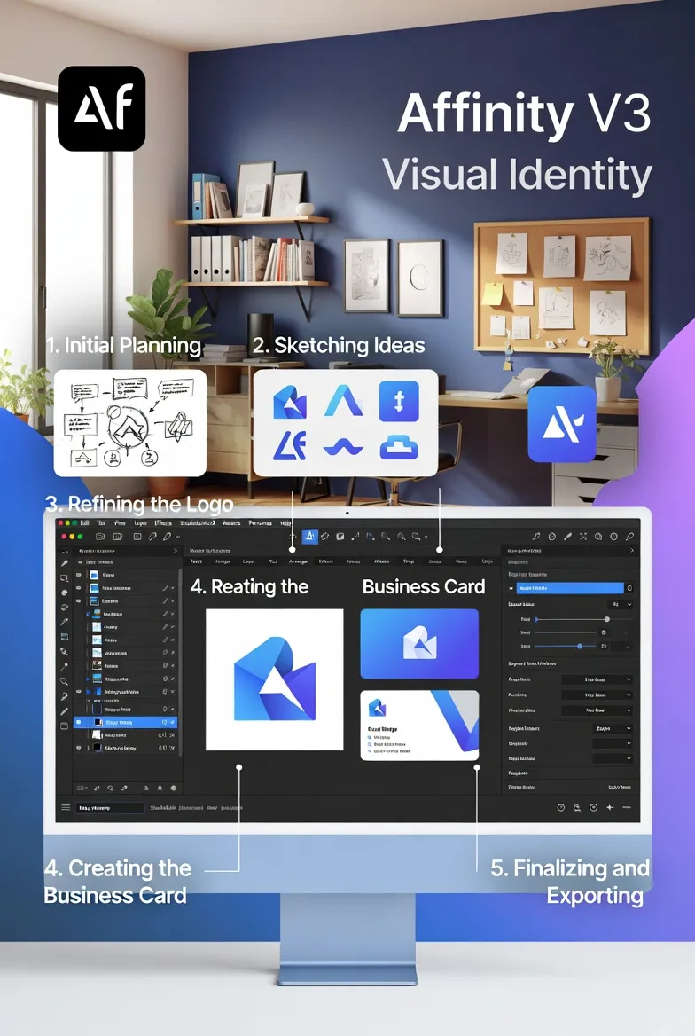 دليل تصميم هوية بصرية كاملة (شعار + كارت + بطاقة عمل) في Affinity V3