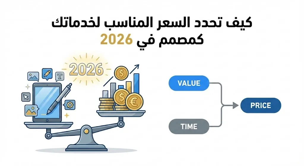 تحديد السعر المناسب لخدماتك كمصمم في 2026 يعتمد على فهم قيمتك، نوع العملاء، وطريقة التسعير المناسبة. لا تخف من رفع أسعارك تدريجيًا، فالسعر المنخفض جدًا يجذب عملاء صعبين، بينما السعر المناسب يجذب عملاء يحترمون وقتك ويقدرون عملك.